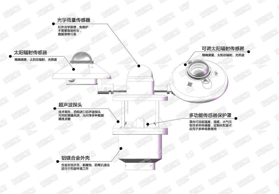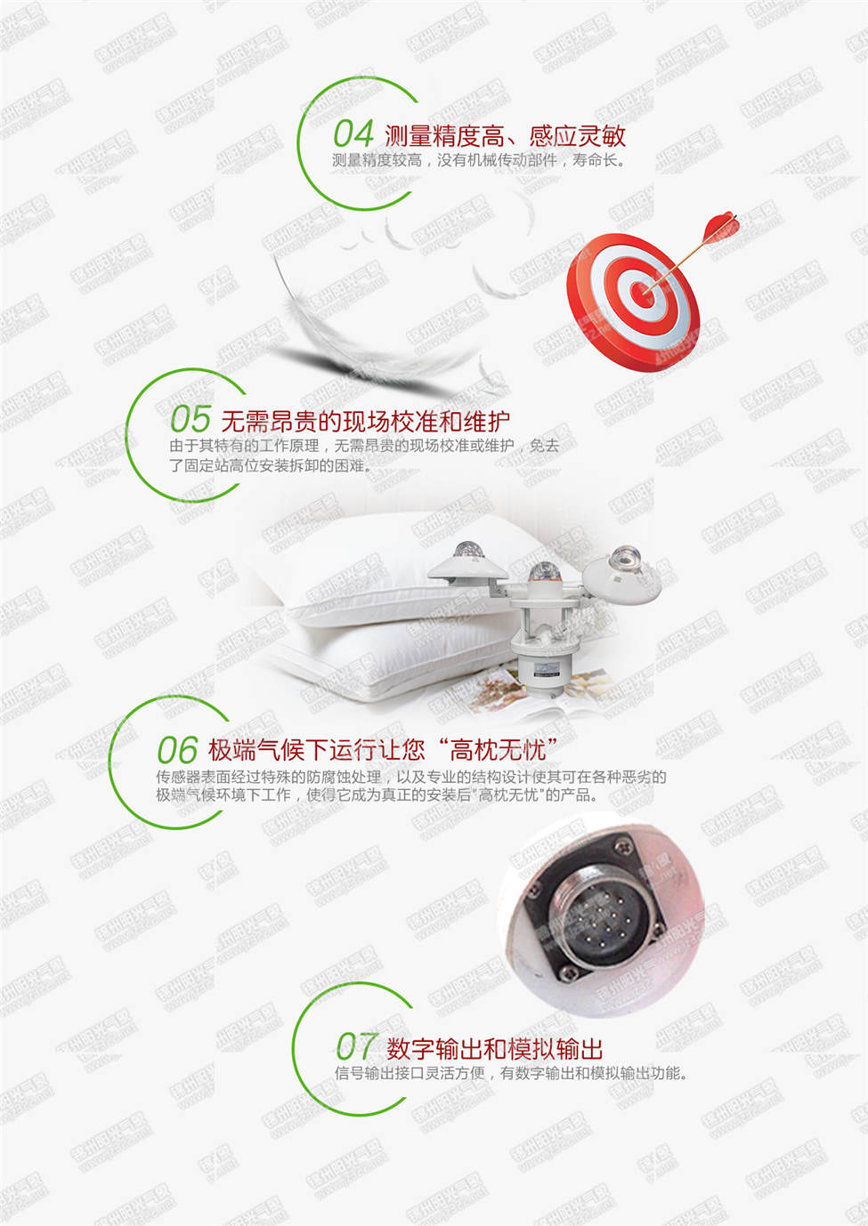 3. 采用先進(jìn)的監(jiān)測技術(shù),風(fēng)速風(fēng)向的監(jiān)測采用了超聲波技術(shù),不但測量精度高,性能穩(wěn)定,而且無需維護(hù);雨量的監(jiān)測采用了光學(xué)的原理,體積小巧、免維護(hù),更適于用在無人值守的現(xiàn)場。