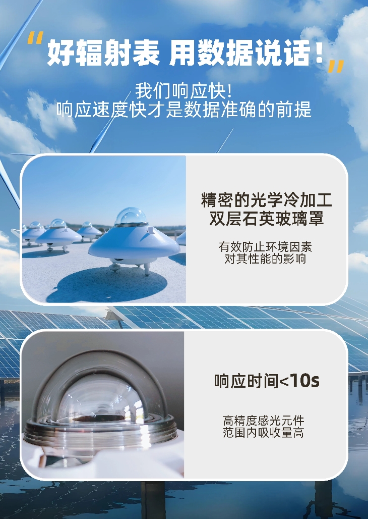 2、響應(yīng)快:響應(yīng)時(shí)間≤10S,對(duì)太陽輻射的微小變化都能迅速響應(yīng),確保數(shù)據(jù)的實(shí)時(shí)性和準(zhǔn)確性。