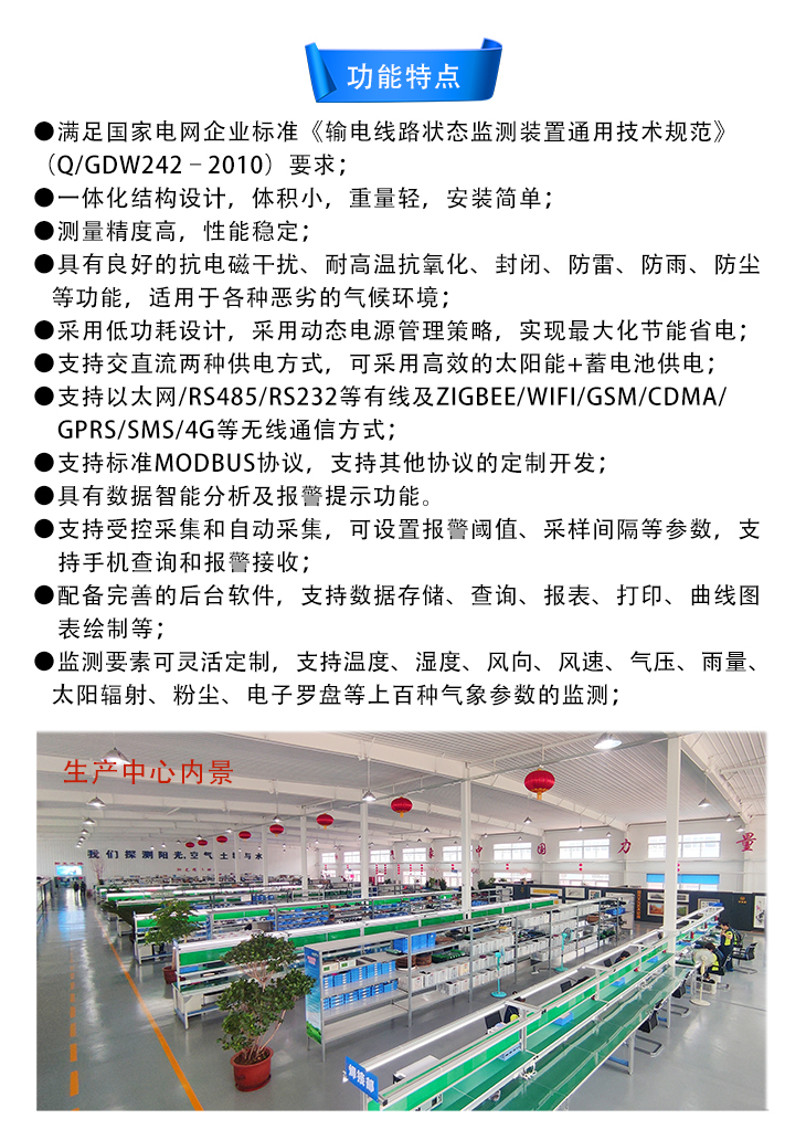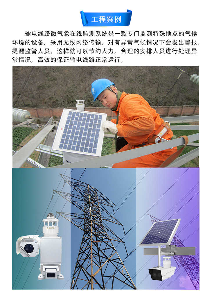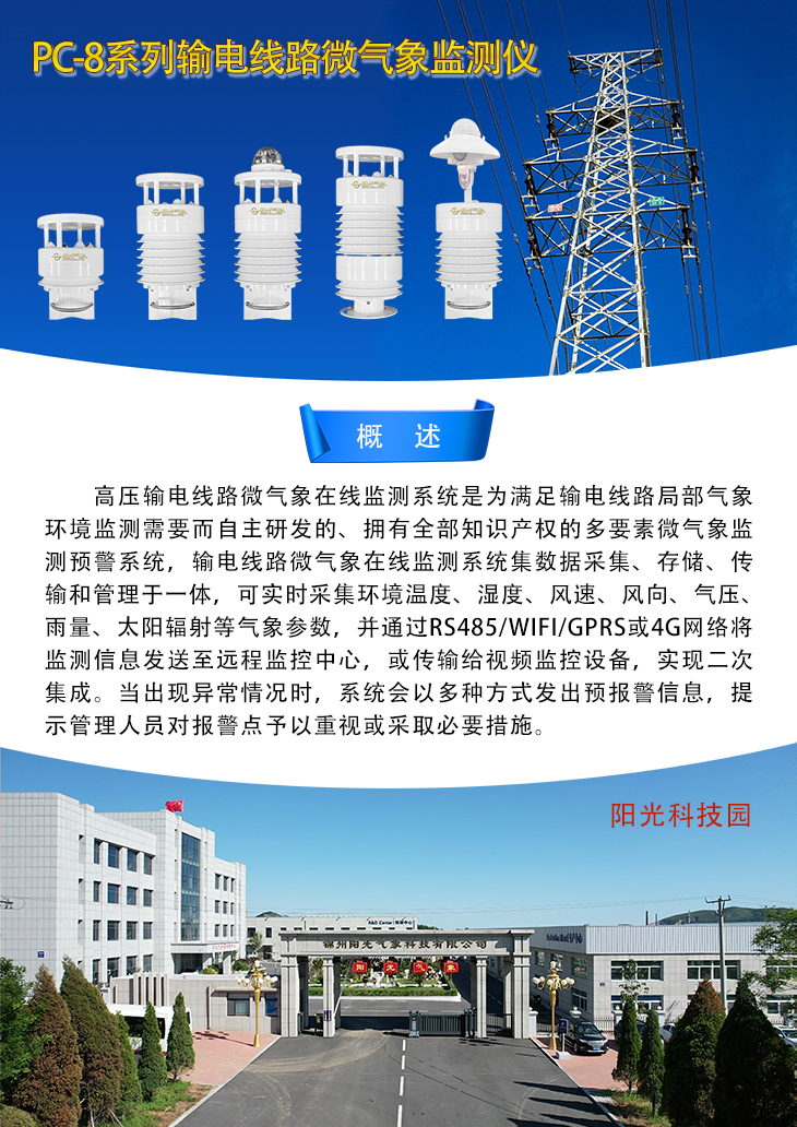 高壓輸電線路微氣象在線監(jiān)測系統(tǒng)是為滿足輸電線路局部氣象環(huán)境監(jiān)測需要而自主研發(fā)的、擁有全部知識產(chǎn)權(quán)的多要素微氣象監(jiān)測預(yù)警系統(tǒng),輸電線路微氣象在線監(jiān)測系統(tǒng)集數(shù)據(jù)采集、存儲、傳輸和管理于一體,可實(shí)時(shí)采集環(huán)境溫度、濕度、風(fēng)速、風(fēng)向、氣壓、雨量、太陽輻射等氣象參數(shù),并通過RS485/WiFi/GPRS或4G網(wǎng)絡(luò)將監(jiān)測信息發(fā)送至遠(yuǎn)程監(jiān)控中心,或傳輸給視頻監(jiān)控設(shè)備,實(shí)現(xiàn)二次集成。當(dāng)出現(xiàn)異常情況時(shí),系統(tǒng)會以多種方式發(fā)出預(yù)報(bào)警信息,提示管理人員對報(bào)警點(diǎn)予以重視或采取必要措施。